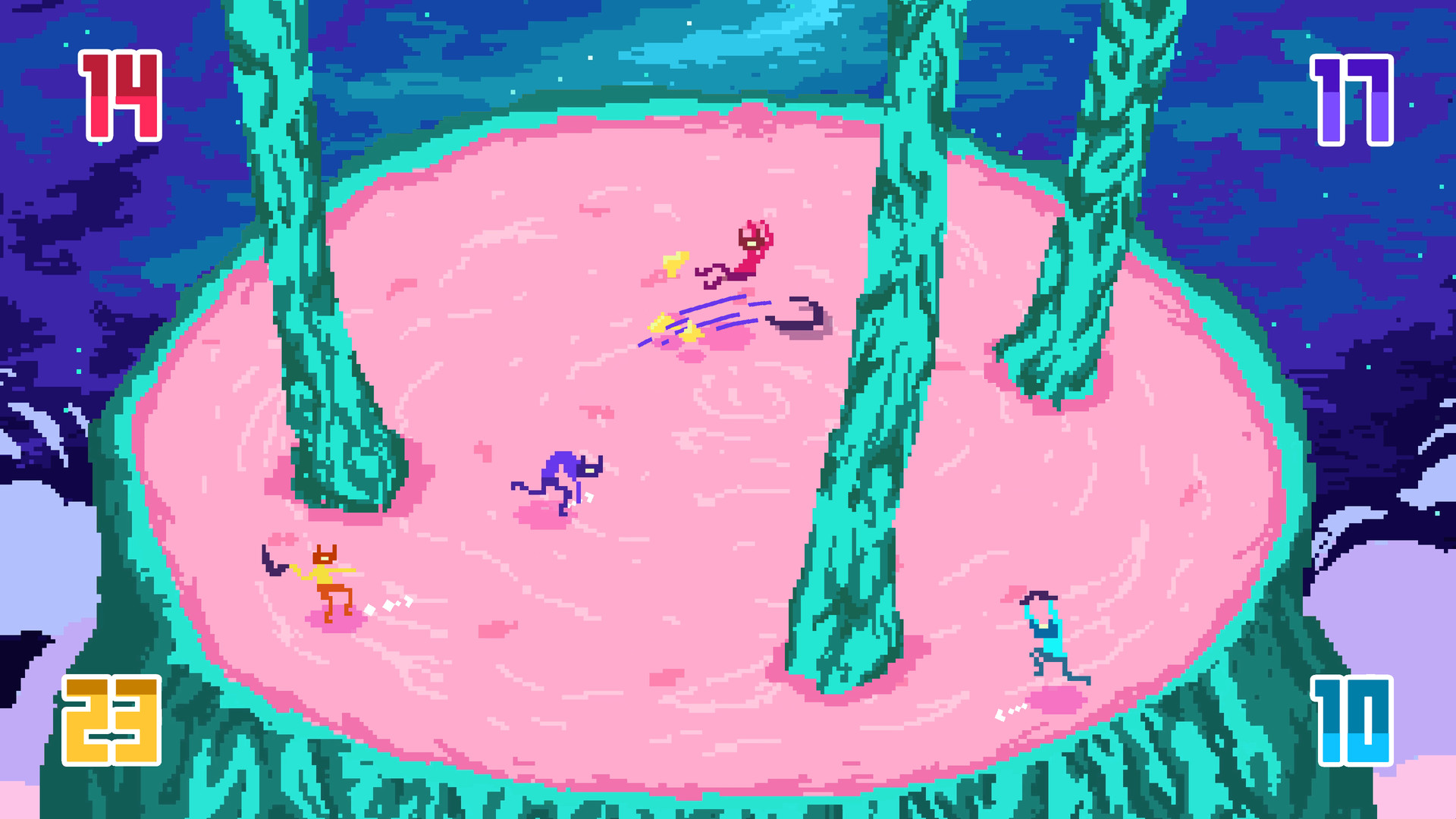 Steal those precious points from your enemies by landing your boomerang throws and throwing them off the platform. But beware, the more points you have, the more you can lose, making it easy for your opponents to catch up.Free for all mayhem or team mode
